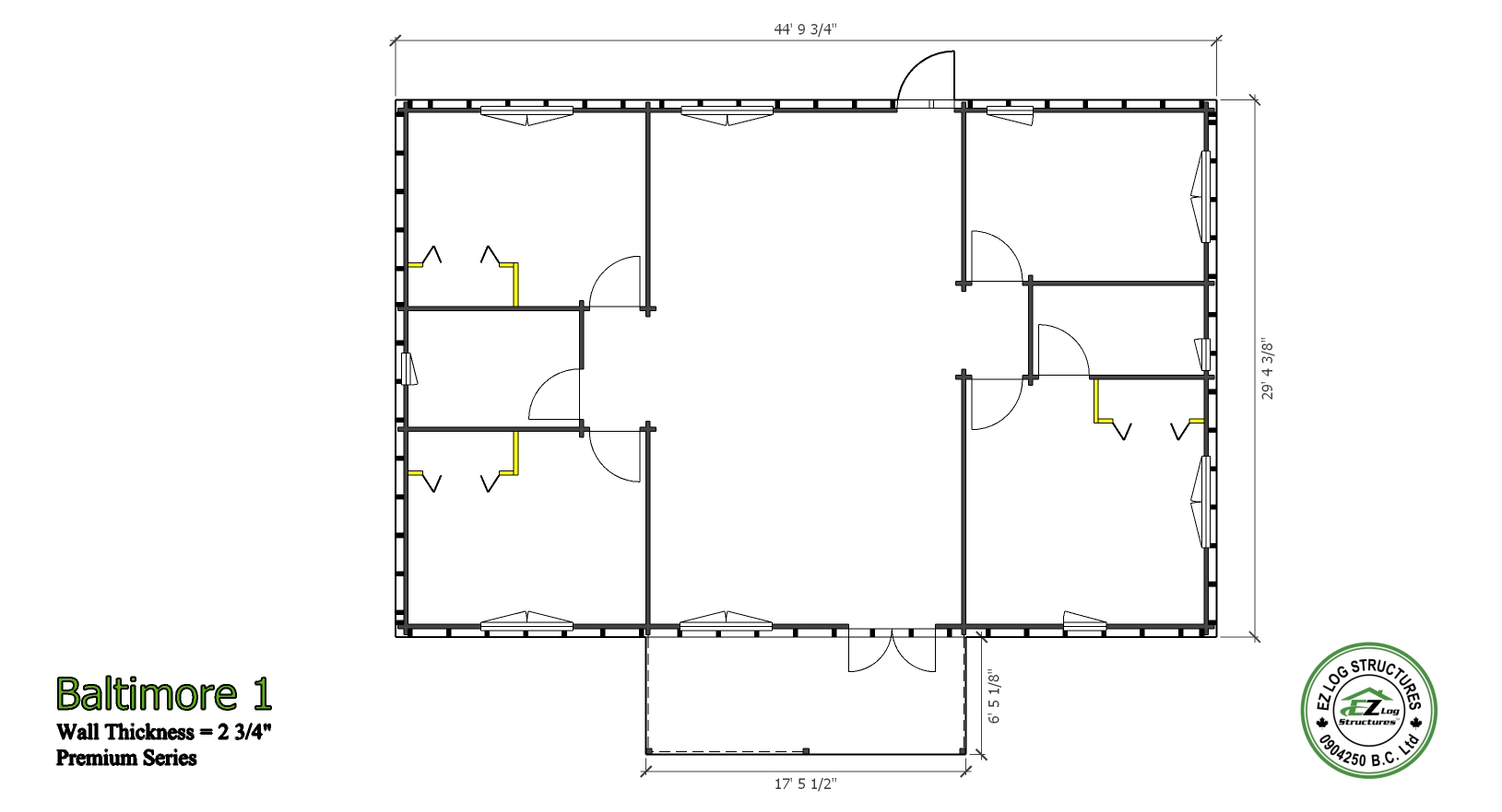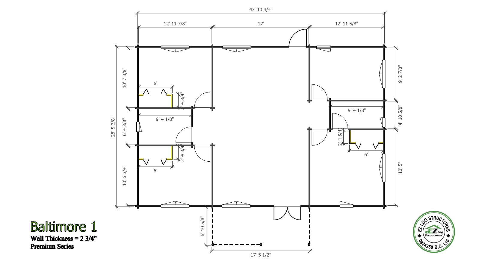 Baltimore is one of our most popular models since it’s introduction in 2010. The current sale price for the Baltimore has some exceptional value for a 3-4 bedroom, 2 bath home. The spacious model is 1246 sq’ with a large open living space & cathedral ceilings in all rooms. Like all our cabin & homes this model meets all structural building codes througout the USA & Canada & is ideal for rural or urban locations. Once the exterior siding is installed over the studs, you would never know this home is a solid wall system until you enter the home. The interior is solid wood and ready for paint or stain. (no drywall required) This method of construction is stronger than conventional framing & more energy efficient.