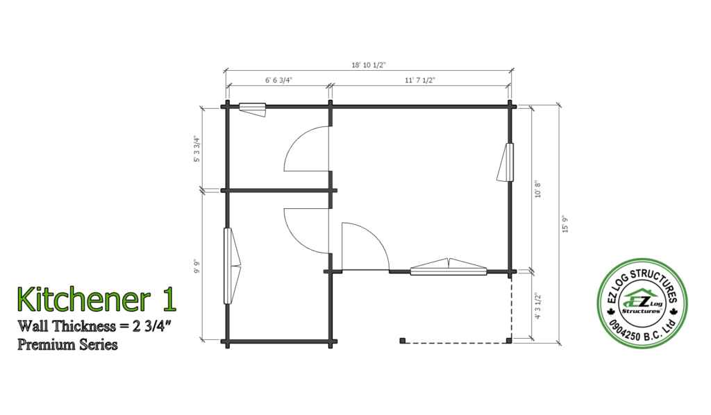 Contact Us >Kitchener 1 is a tiny home, cabin, granny flat, in-law suite, ADU with 1 bedroom, 1 bath home and vaulted ceilings throughout. It has solid stacked walls using 70mm (2-3/4″) thick logs. Like all our models it can be customized to fit your personal needs. (sq footage is based the total footprint, living space could be less, see floor plans)