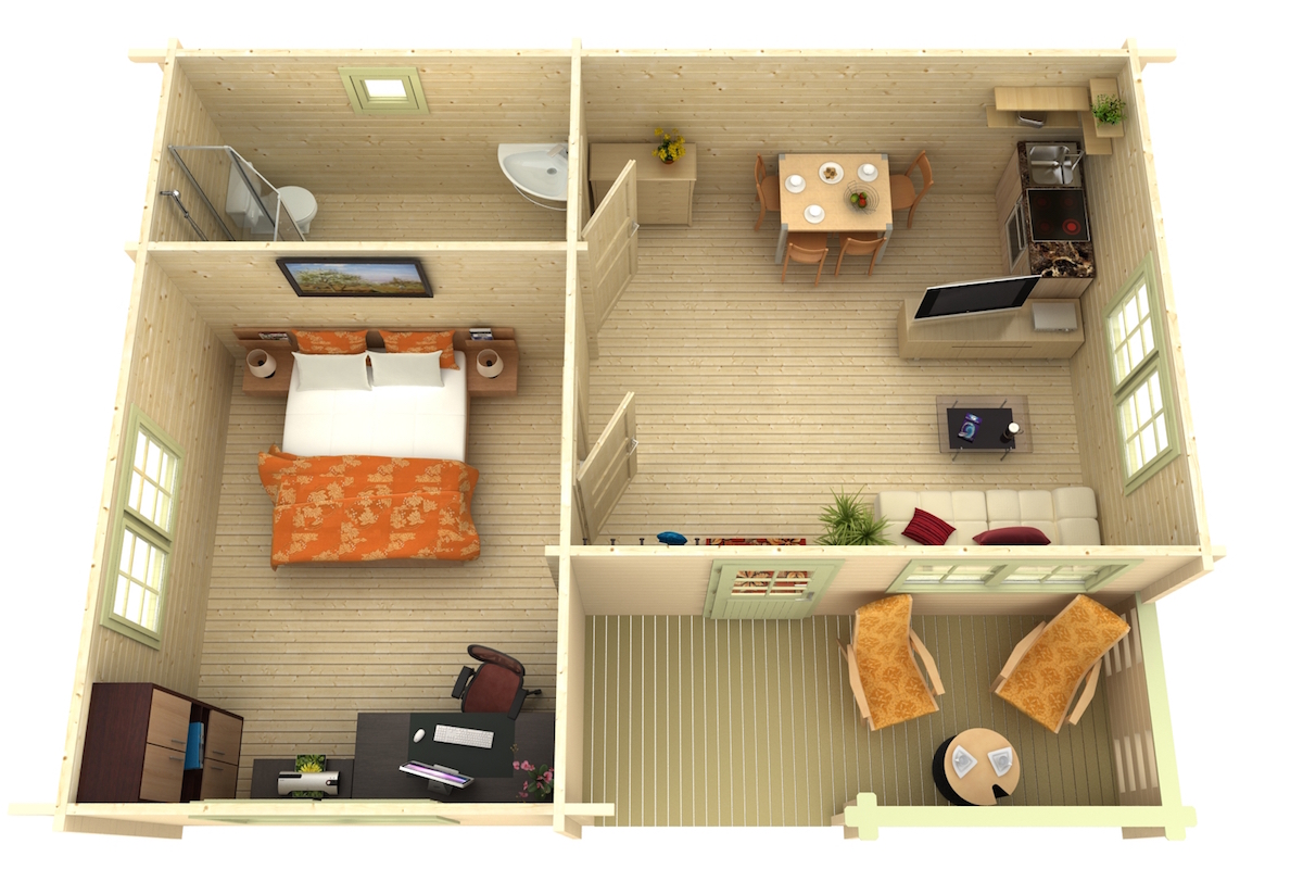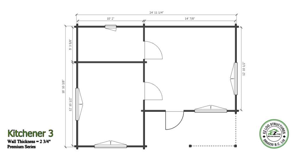 Contact Us >Kitchener 3 is a smaller cabin or tiny home with 3 rooms and a covered deck area with a total foot print of 469 sq’. Like all our models it can be customized to fit your personal needs. (sq footage is based the total footprint, living space could be less, see floor plans)